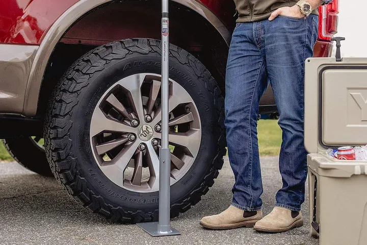 Setting up your flagpole on the go is now a breeze, thanks to our tire mount. This metal tire flag pole holder goes under the wheel of your car or truck, and secures your pole anywhere you park! The tire mount holds all-size flagpoles up to 1.5″ in diameter.