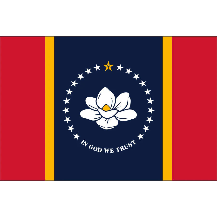 This flag was chosen by the Commission to Redesign the Mississippi State Flag and was approved by state referendum on November 3, 2020. Afterward, it was passed by the state legislature on January 6, 2021, and it became the official state flag of the U.S. state of Mississippi on January 11, 2021. A white magnolia blossom is featured on a red background with the words “In God We Trust” with a gold border and blue sides.
