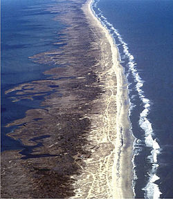 The Outer Banks (frequently abbreviated OBX) are a 200 mi string of barrier islands and spits off the coast of North Carolina and southeastern Virginia, on the east coast of the United States. They line most of the North Carolina coastline, separating Currituck Sound, Albemarle Sound, and Pamlico Sound from the Atlantic Ocean.